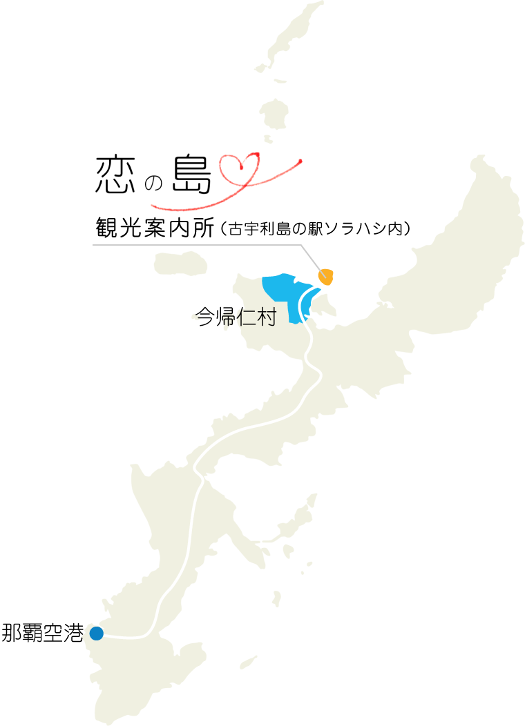 お車(レンタカー)でお越しの方 バスをご利用の方 那覇バスターミナルからバスでもお越しいただけます。 やんばる急行バス 公式サイトはこちら 所在地 恋の島観光案内所(古宇利島の駅 ソラハシ内)〒905-0406 沖縄県国頭郡今帰仁村古宇利323-1TEL. 0980-56-2128